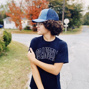 6-panel mesh back trucker hat with circular de-bossed PU leather patch.